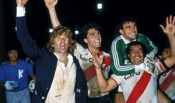 EMBARRADO como si hubiera jugado, en su ciclo cumbre como entrenador, campeón de Argentina, América y el mundo con River Plate. Con Ruggeri, Pumpido y Gallego.